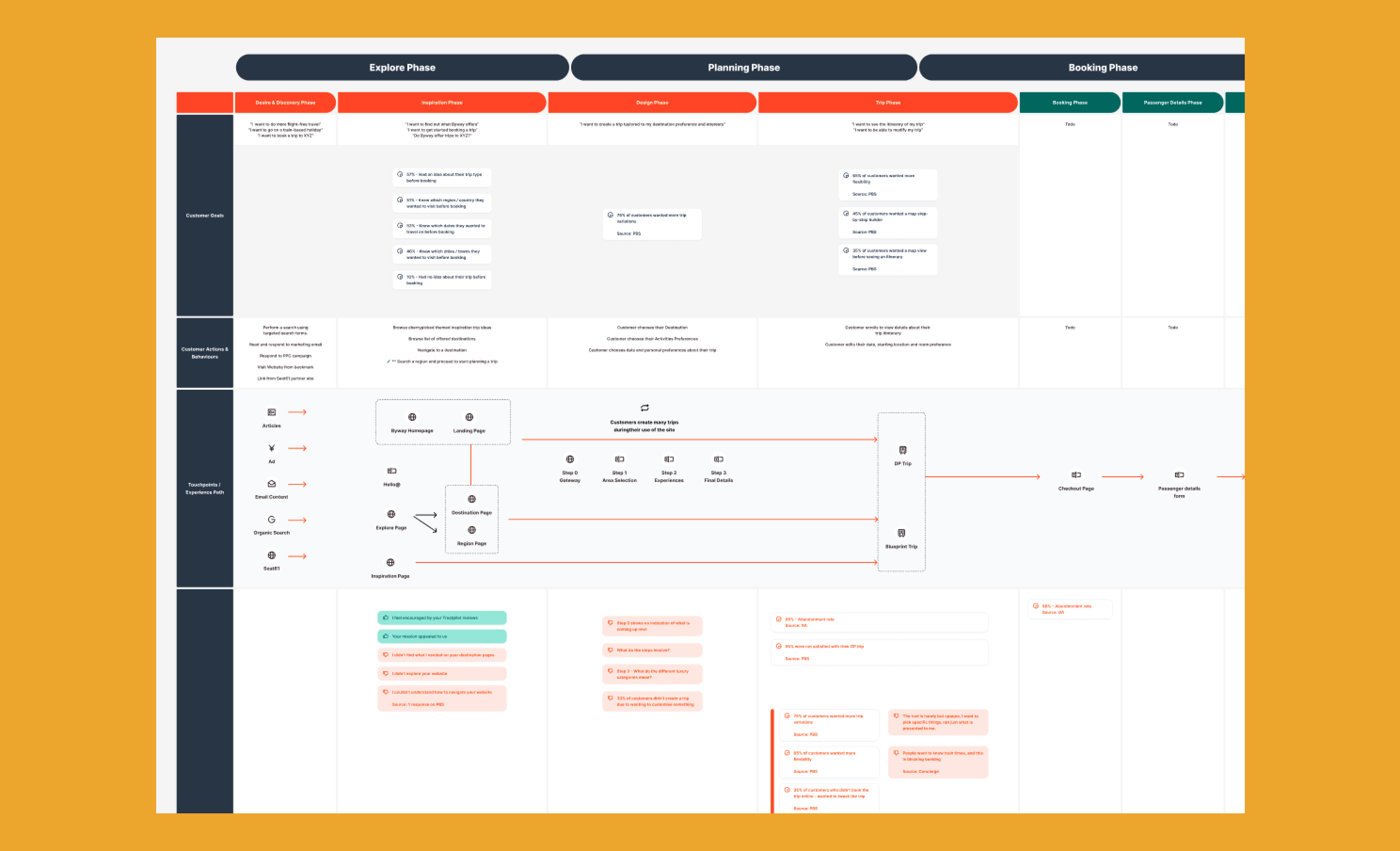 I produced customer Journey maps which helped with a number of things. First it identified and standardised communication between teams, we could refer to steps in the customer journey in a language that was consistent across the organisation. Second, it accurately segmented the user experience which could focus effort in information gathering.