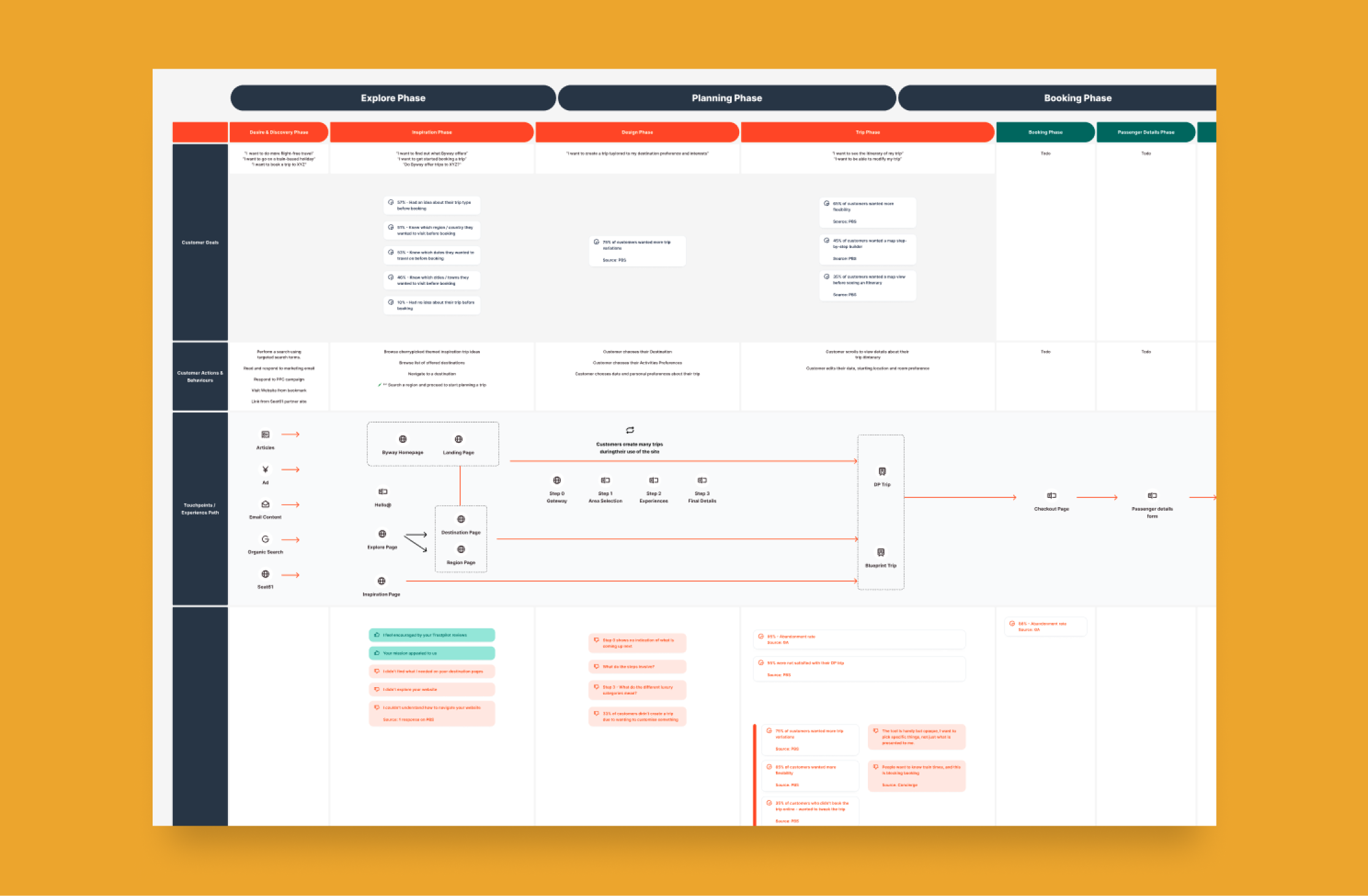 Additional insights were gathered from running quick A/B tests on areas of the site and gauging click rate to determine if this was information the customer was interested in and therefore needed to be prioritised in the design. An experience map was produced to help present the customers journeys to multiple internal stakeholders.