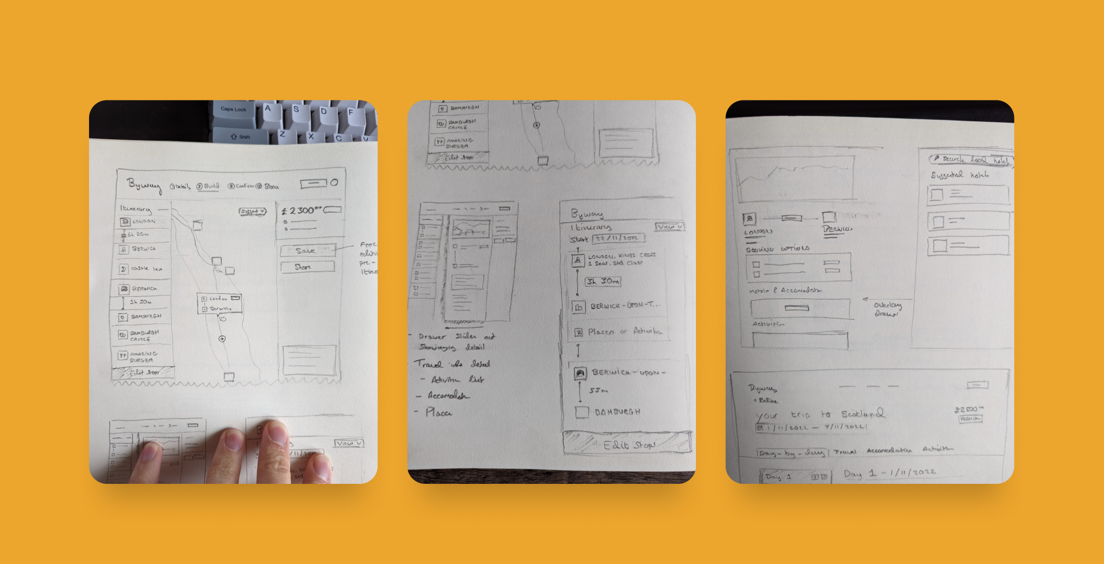 Byway wanted to see ideas fairly swiftly to see my thinking process more clearly. I began to flesh out low-fidelity wireframes and receive internal feedback to further refine the vision.