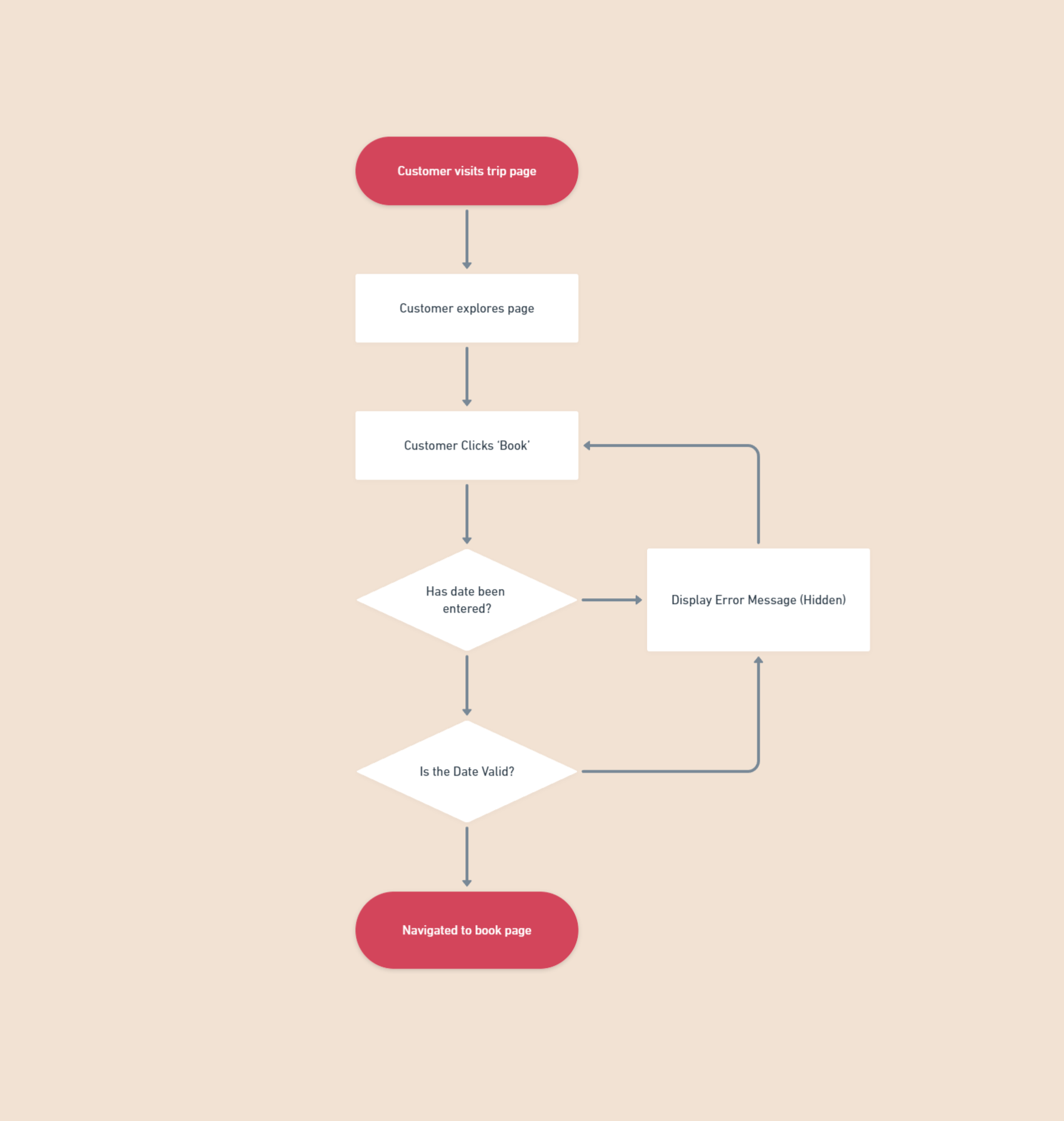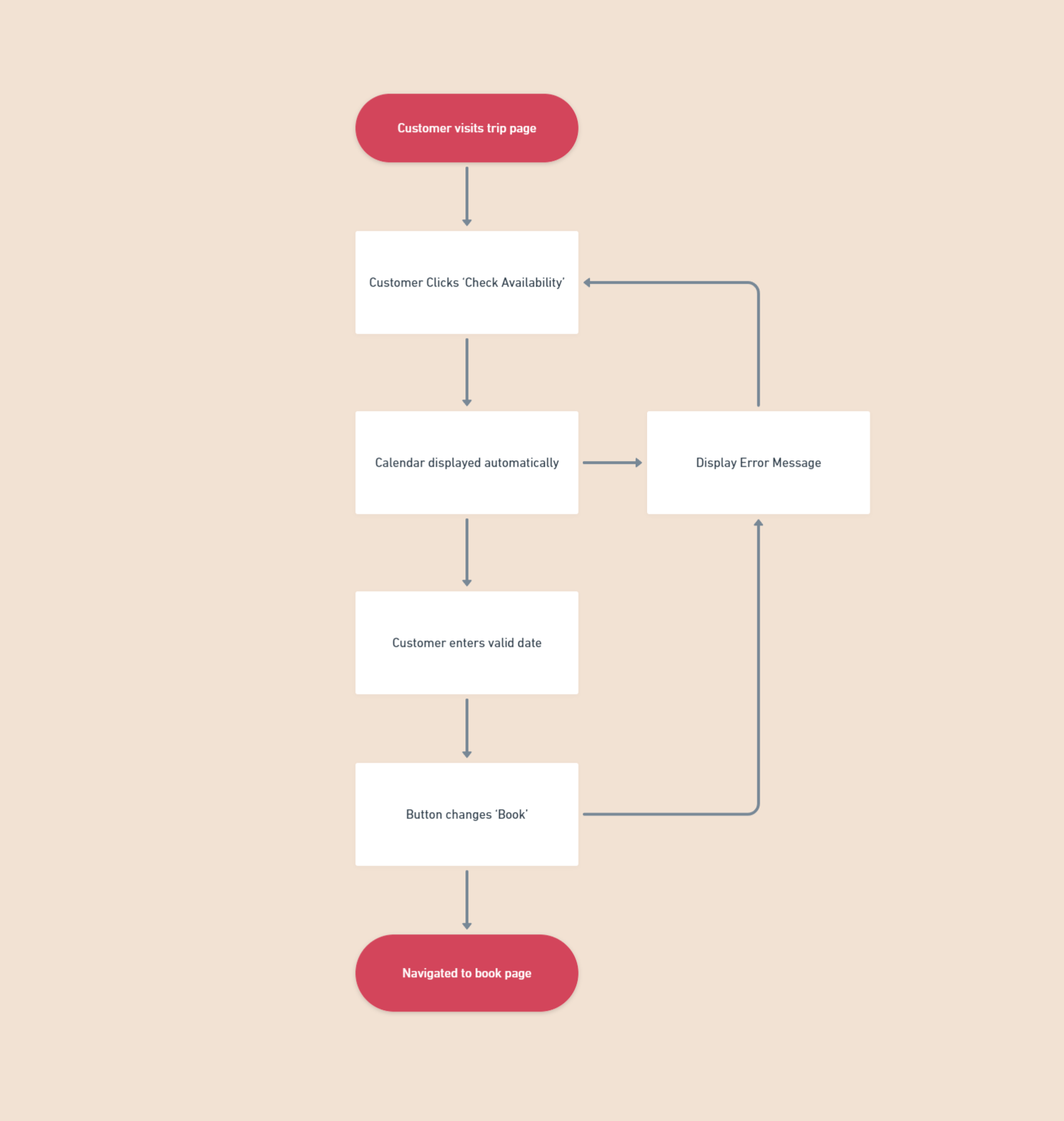 The solution was first theorised in the user flow diagram by describing automatic system behaviours to help the customer smoothly on their way to the booking page.