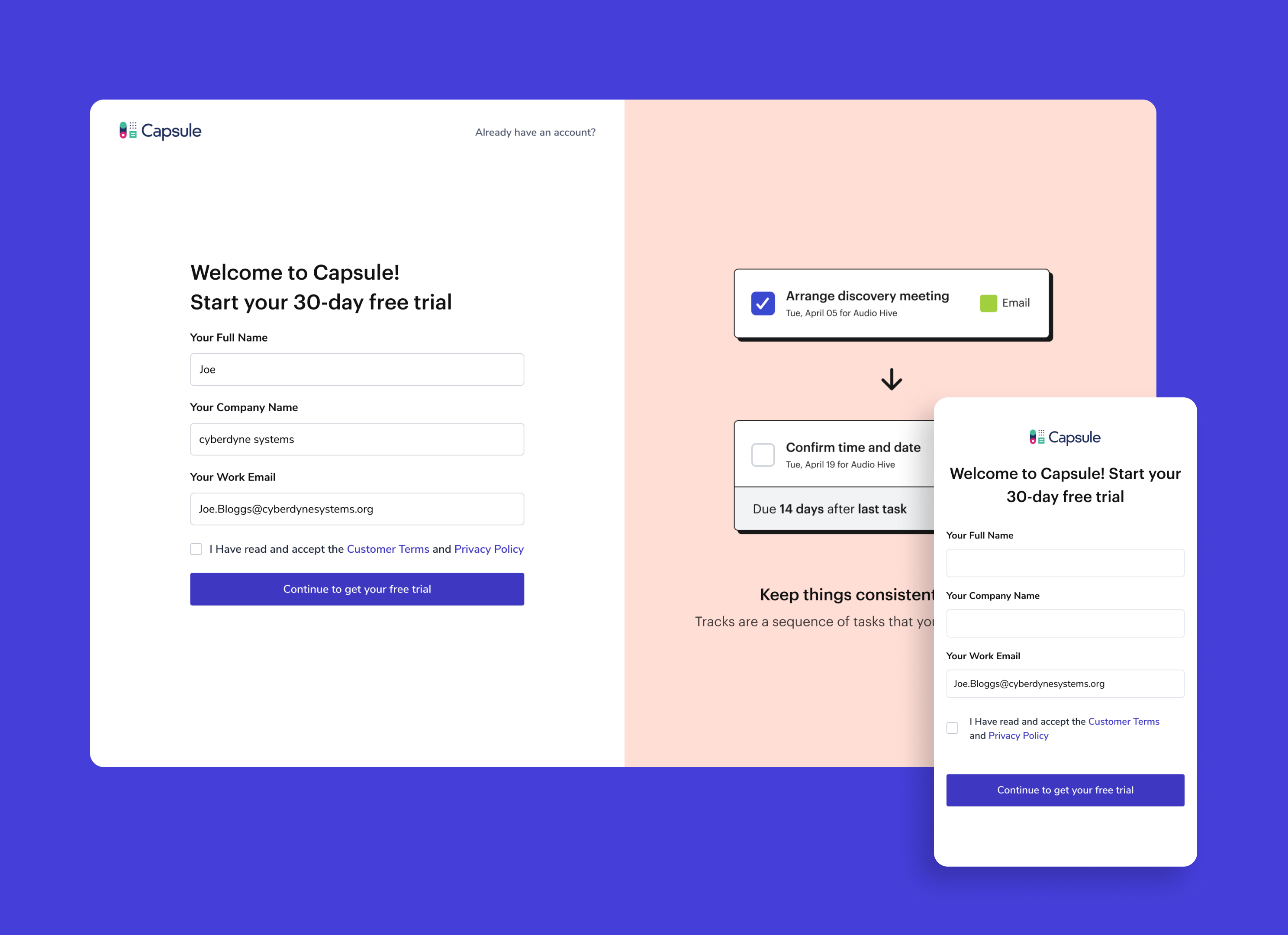 Referring back to the goals of this project, an optimised mobile signup experience was a high priority. Whilst not designed mobile-first as Capsule's audience were primarily desktop-based, transioning the desktop design to mobile was simple, thanks to the simple approach to the form design.