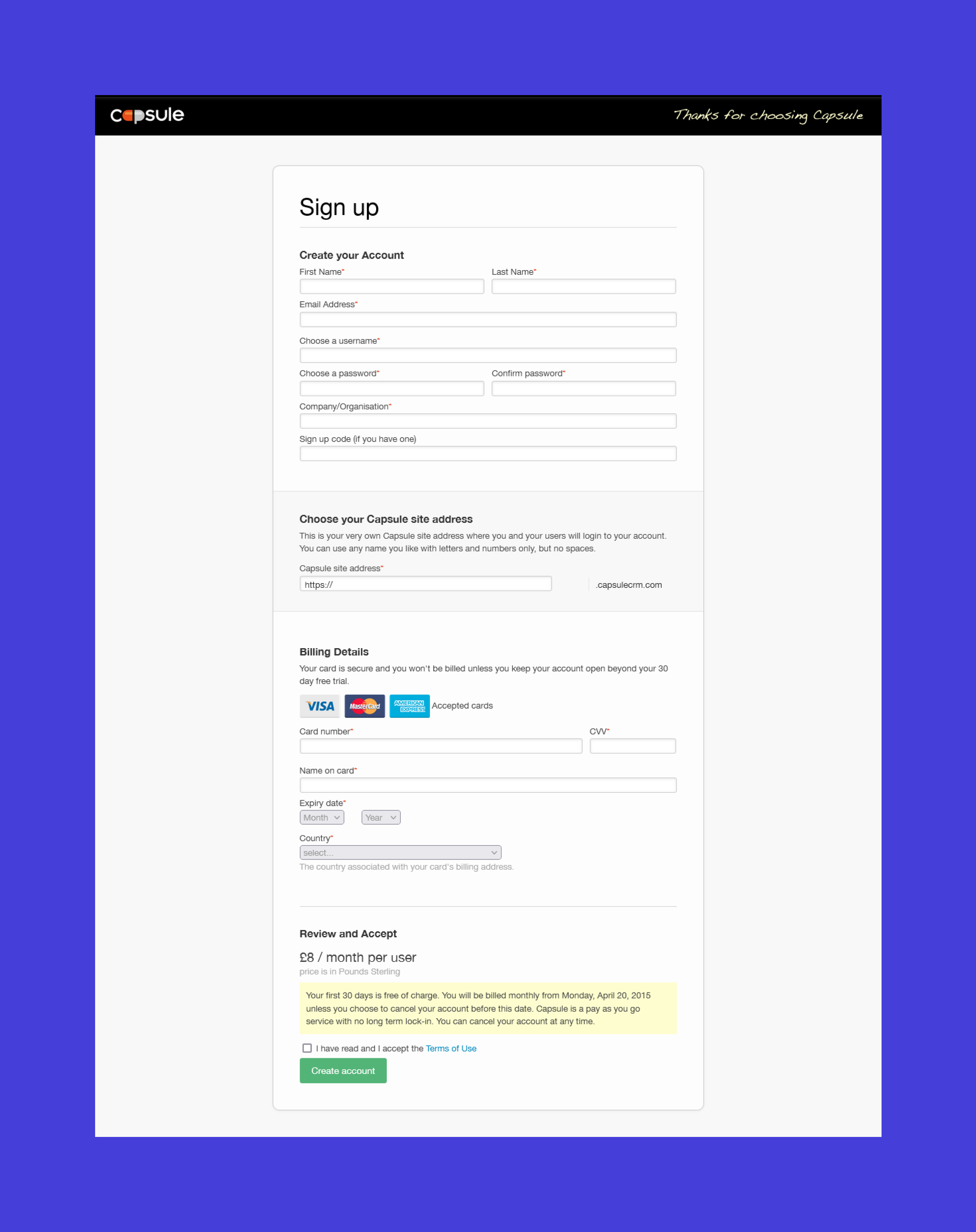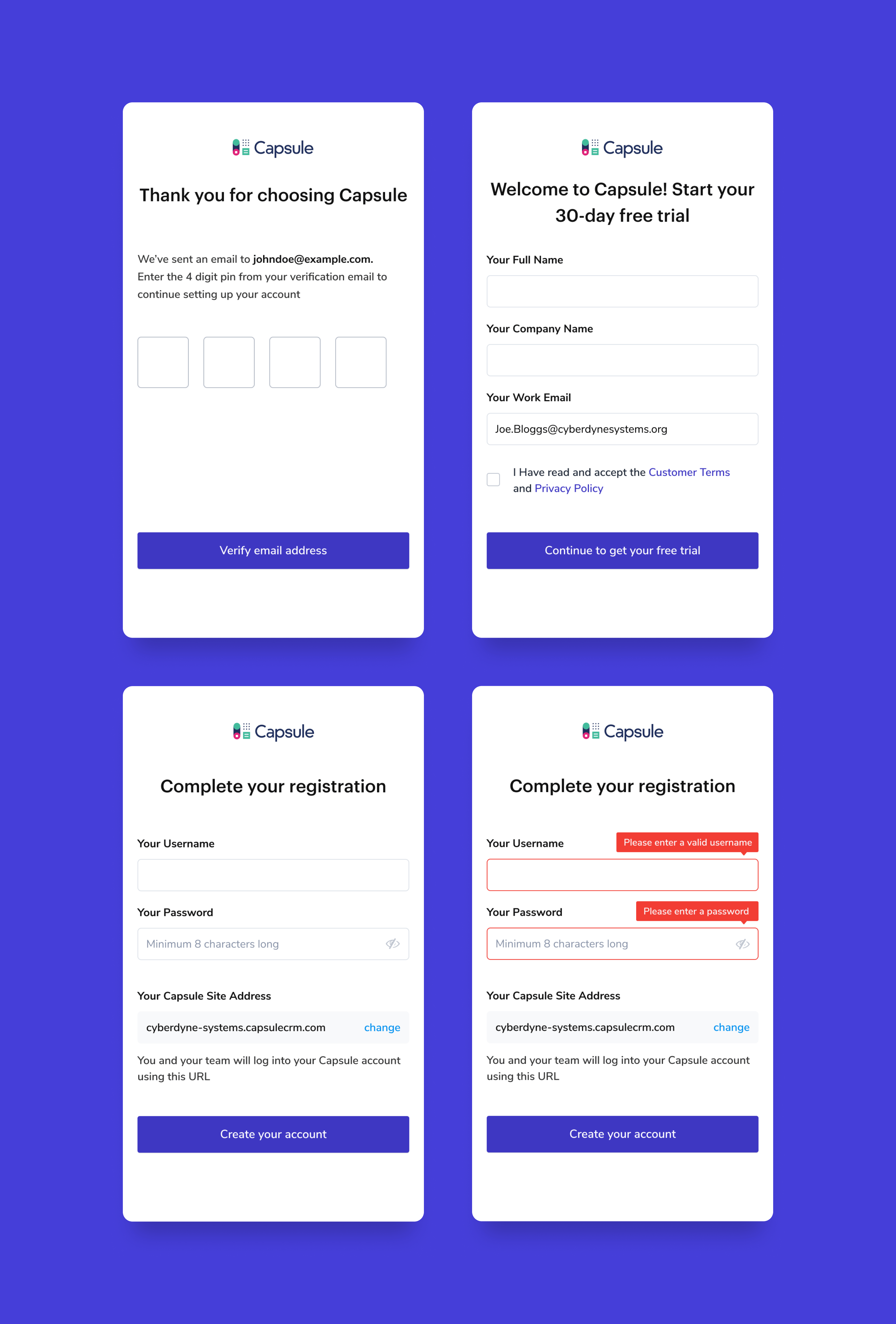 - Reduce information volume - Reduce the amount of information a new customer has to enter before being able to access their Capsule account. Which will have a knock on effect on other goals directly.