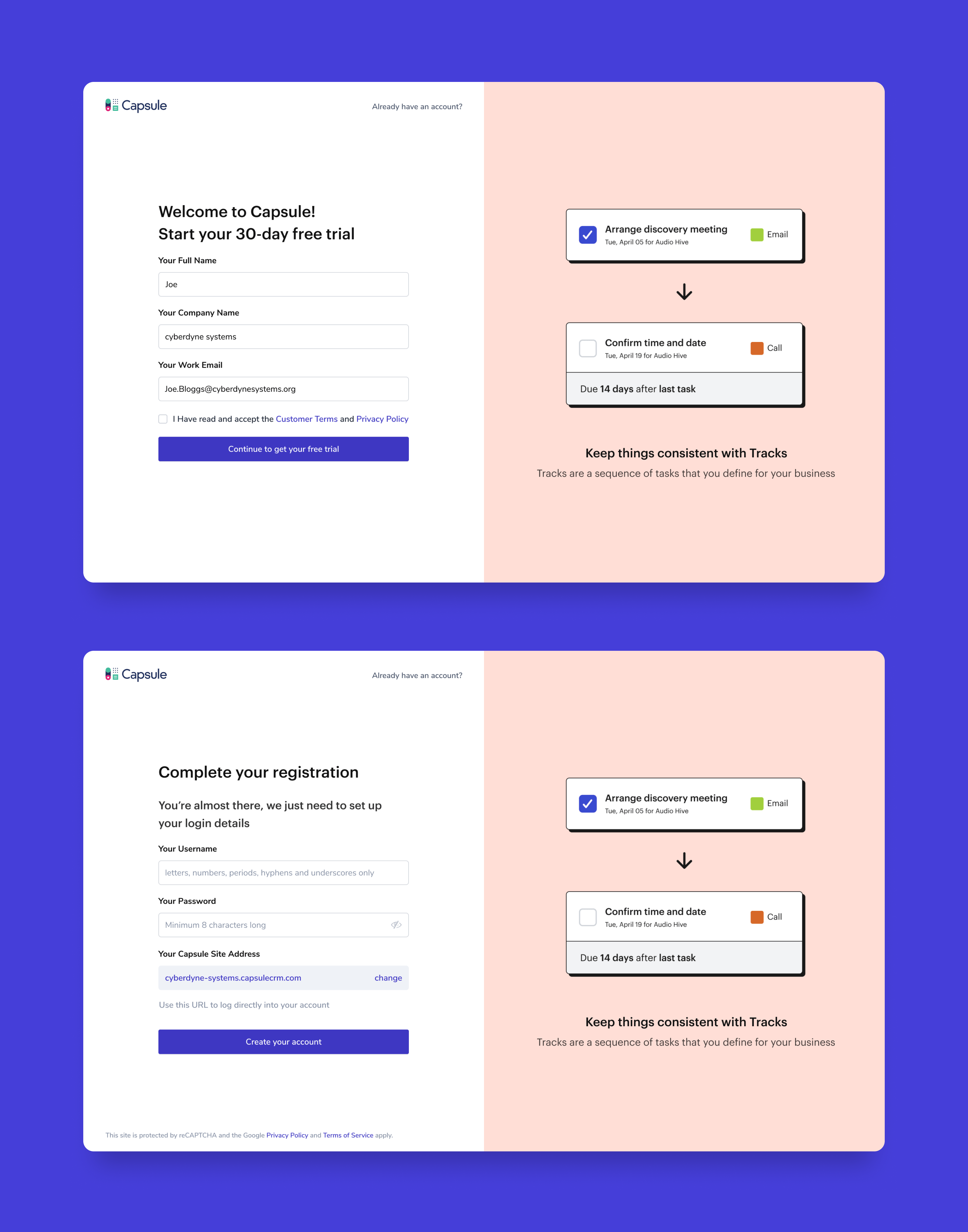 - Reduce information volume - Reduce the amount of information a new customer has to enter before being able to access their Capsule account. Which will have a knock on effect on other goals directly.